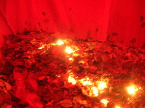 I transformed a tiny room in a haunted barracks into a weird rendition of a heart. I lay under the pile of lights and leaves and fabric for the three hour duration of an art show, breathing to the rhythm of a recording I made of a frame drum beat imitating a heartbeat and the sound of breathing. People visited the installation and sat in there, while the pile of leaves rose and fell methodically. I coughed up gross black lung leaf material after that.